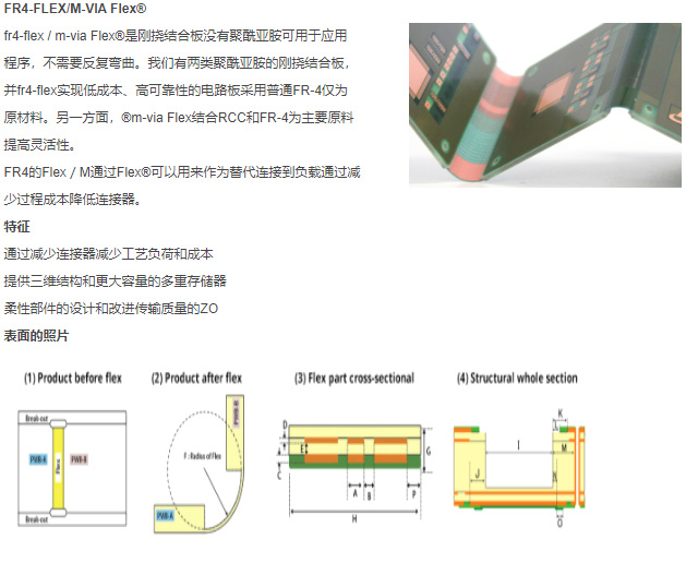 Fr4-flex/m-viaFlex ® There is no polyimide available for the application of rigid flex bonding plates, so there is no need for repeated bending. We have two types of rigid flex polyimide boards, and FR4 flex achieves low-cost and high reliability circuit boards using ordinary FR-4 as the raw material. On the other hand, ® M-via Flex combines RCC and FR-4 as the main raw materials to improve flexibility.