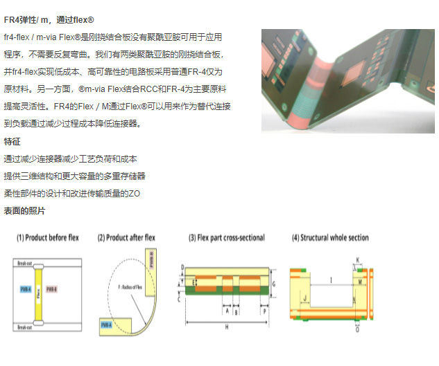 fr4-flex/m-viaFlex®是刚挠结合板没有聚酰亚胺可用于应用程序,不需要反复弯曲。我们有两类聚酰亚胺的刚挠结合板,并fr4-flex实现低成本、高可靠性的电路板采用普通FR-4仅为原材料。另一方面,®m-viaFlex结合RCC和FR-4为主要原料提高灵活性。FR4的Flex/M通过Flex®可以用来作为替代连接到负载通过减少过程成本降低连接器。